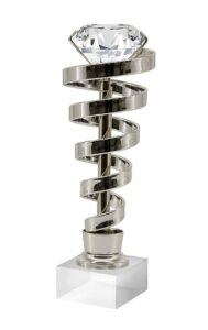 Diamond Award – Jarama Silver colored spiral metal award. Crystal base and transparent diamond on top. Possible variations Code Price Size Diameter 19.948 € 169,95 28cm 10cm (Prices excl. vat and engraving) Why Toulet – Van Bael? Always a lay-out Belgian Family Company Big Stock Easy access Fast quote and delivery Value for Money